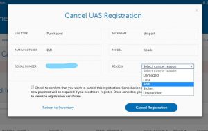 6 – Cancel UAS Registration – If you are ready to cancel, you will now be on the final screen.  Select a reason why you are cancelling in the drop down menu on the bottom right side that says “Select cancel reason”.  Options are Damaged, Lost, Sold, Stolen and Unspecified.  For most purposes you should select “Sold”.