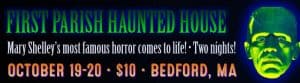First Parish Haunted House in Bedford, MA – October 19-20, only $10 ($5 for kids during day) This haunted house only runs for 2 days, so act quickly before the fun is over. From October 19th and 20th they will be celebrating the 200th anniversary of Mary Shelley’s novel “Frankenstein”. They also have a Saturday afternoon event that is good for smaller kids and parents. So, to recap: