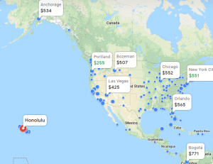 Eventually I had the best luck finding the lowest fare by using the map view on Google Flights.  I began my search in reverse by selecting Honolulu as my departure city and seeing what cities showed up with the cheapest fares.  This doesn’t always work, but is worth a try – sometimes you can find a really cheap departure city like the one below that shows Portland, Oregon at $255 round trip.