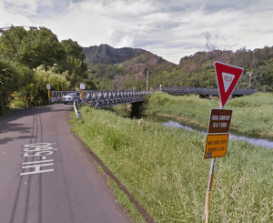 Here’s a link to Google Street View of the hardest to cross one lane bridge on Hwy 560 over the Wainiha River.  The tough part about this one is if you are heading west you have to look carefully to see if cars are coming on the far side of the bridge.